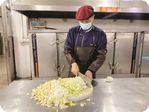 到崗的時候天氣正熱,工作量心里沒底,但他不動聲色,跟著老廚師長邊學(xué)、邊問、邊記,很快摸清了工作流程:每天按菜譜報所需菜量,驗菜、洗菜、配菜,炒、煮、上菜,收飯桶,清理后廚。作息時間,早上5點就要到崗,下午7點以后才能休息。