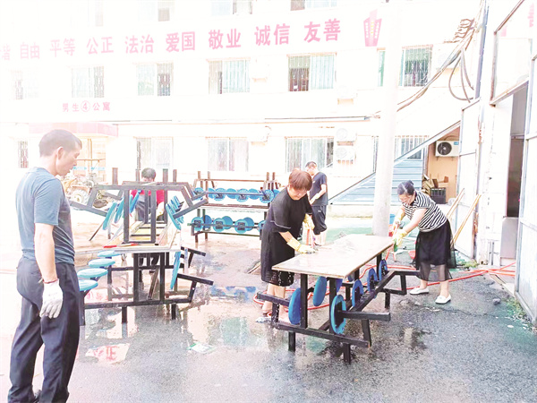 8月16日一大早,該公司從班子成員到普通員工拿著水桶、鋼絲球、鏟刀、抹布、清洗劑等工具,開(kāi)始對(duì)學(xué)校餐廳150余張就餐桌椅進(jìn)行全面清潔,不放過(guò)每一個(gè)死角。清潔過(guò)的桌椅擺放整齊后,又對(duì)餐廳地面進(jìn)行清潔,食堂環(huán)境煥然一新。(杜旭哲)