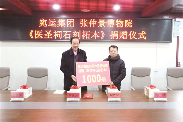 2月15日,集團公司黨委書記、董事長胡逸云,黨委副書記、副董事長、紀(jì)委書記韋獻新,總經(jīng)理華磊,副總經(jīng)理高明濤及機關(guān)工作人員,專程到張仲景博物院捐贈《醫(yī)圣祠石刻拓本》1000冊。