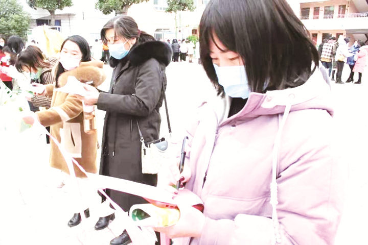 老師們聚集在燈謎前,有的盯著燈謎苦思冥想,有的為猜中謎底而開心不已,也有對謎底不確定的老師們在小聲討論。最后,所有燈謎謎底都被一一猜中。